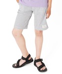 薄いストライプ柄のパンツとパステルカラーのTシャツで、 柔らかい印象のコーデに♪ 可愛くなりすぎないよう足元は黒のスポーツサンダルで引き締めて◎