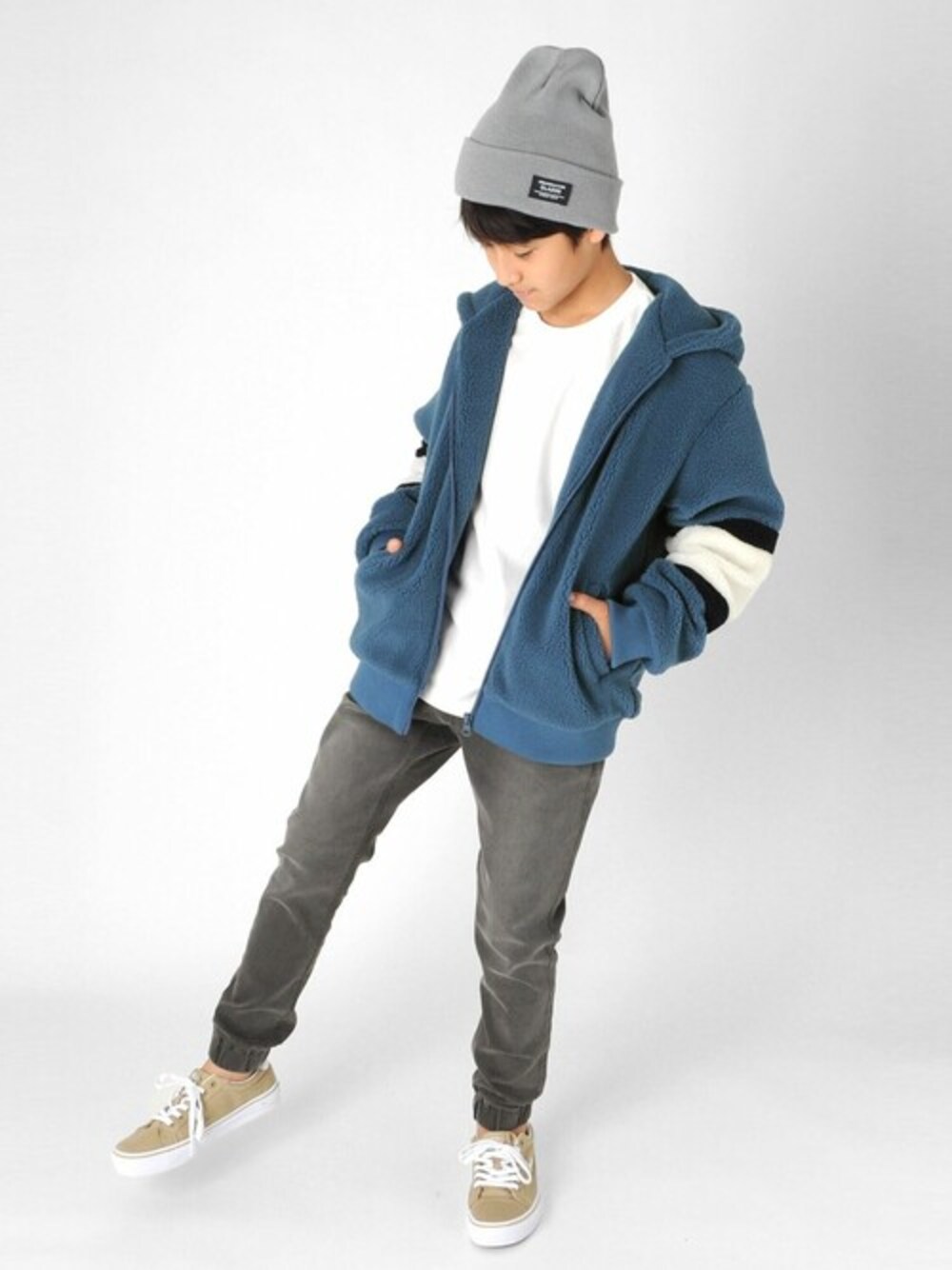 シンプルなコーデにアクセントのあるボアパーカーを羽織りました★ パーカーのカラーを活かし、全体をグレートーンでまとめて統一感を演出◎