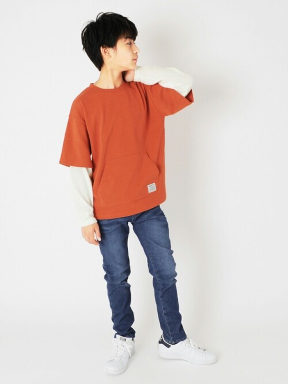 デニムを合わせてオレンジのトップスを主役に◎ 袖のレイヤードがコーデに爽やかさをプラスしてくれます!