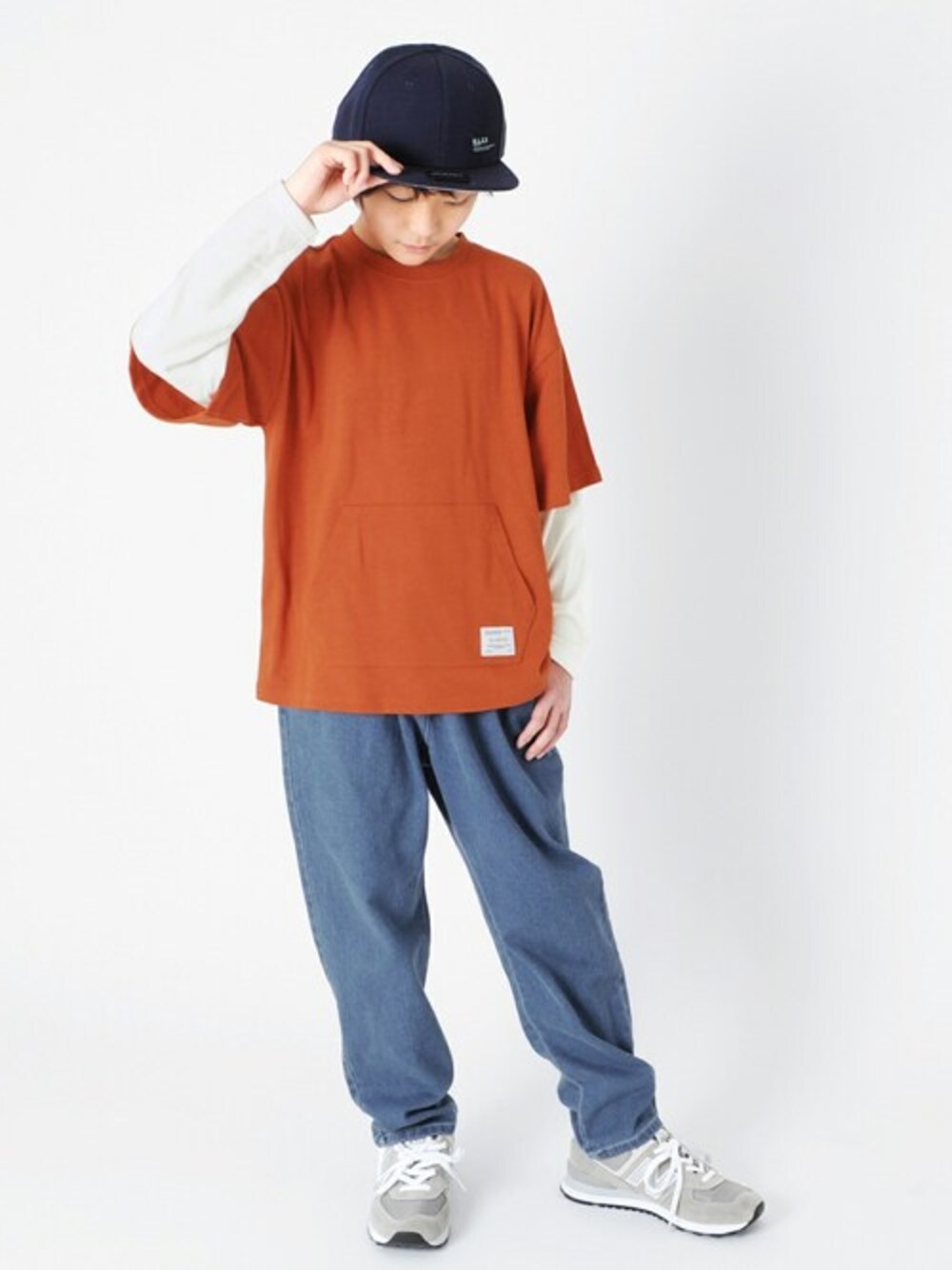 春らしいオレンジのトップスにデニムを合わせてストリートスタイルに! 袖がレイヤードやキャップがオシャレさをアップしてくれます◎
