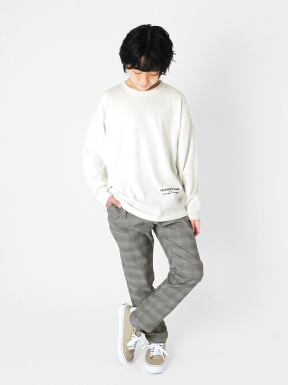シンプルなトップスにはチェックパンツを合わせてアクセントに! テーパードパンツを合わせるとすっきりとスタイリッシュな印象に◎