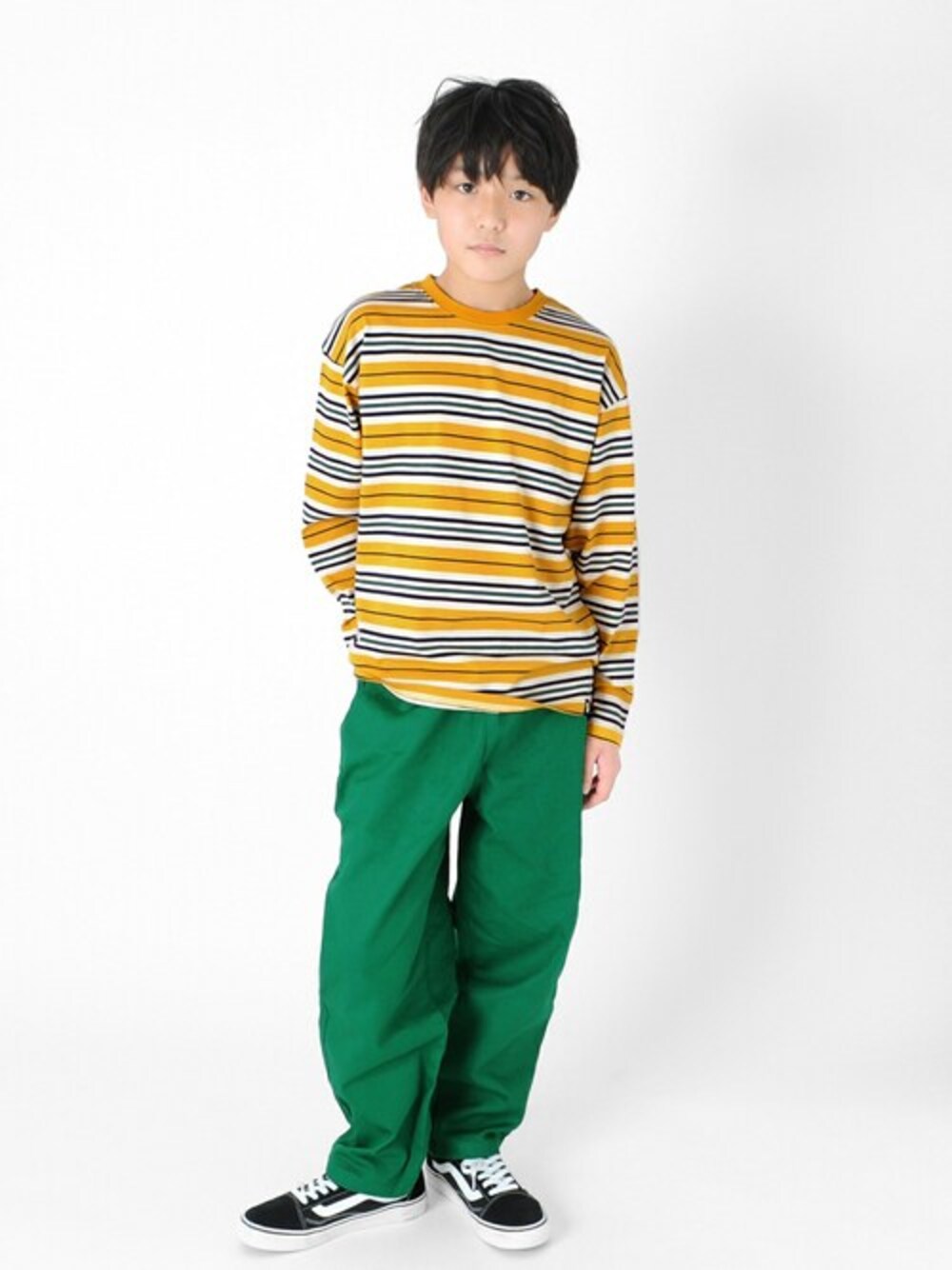 一枚で着てもサマになるボーダーTにあえてカラーパンツを合わせたコーデ。 今っぽいルーズシルエットでストリート・スケータースタイルに!!