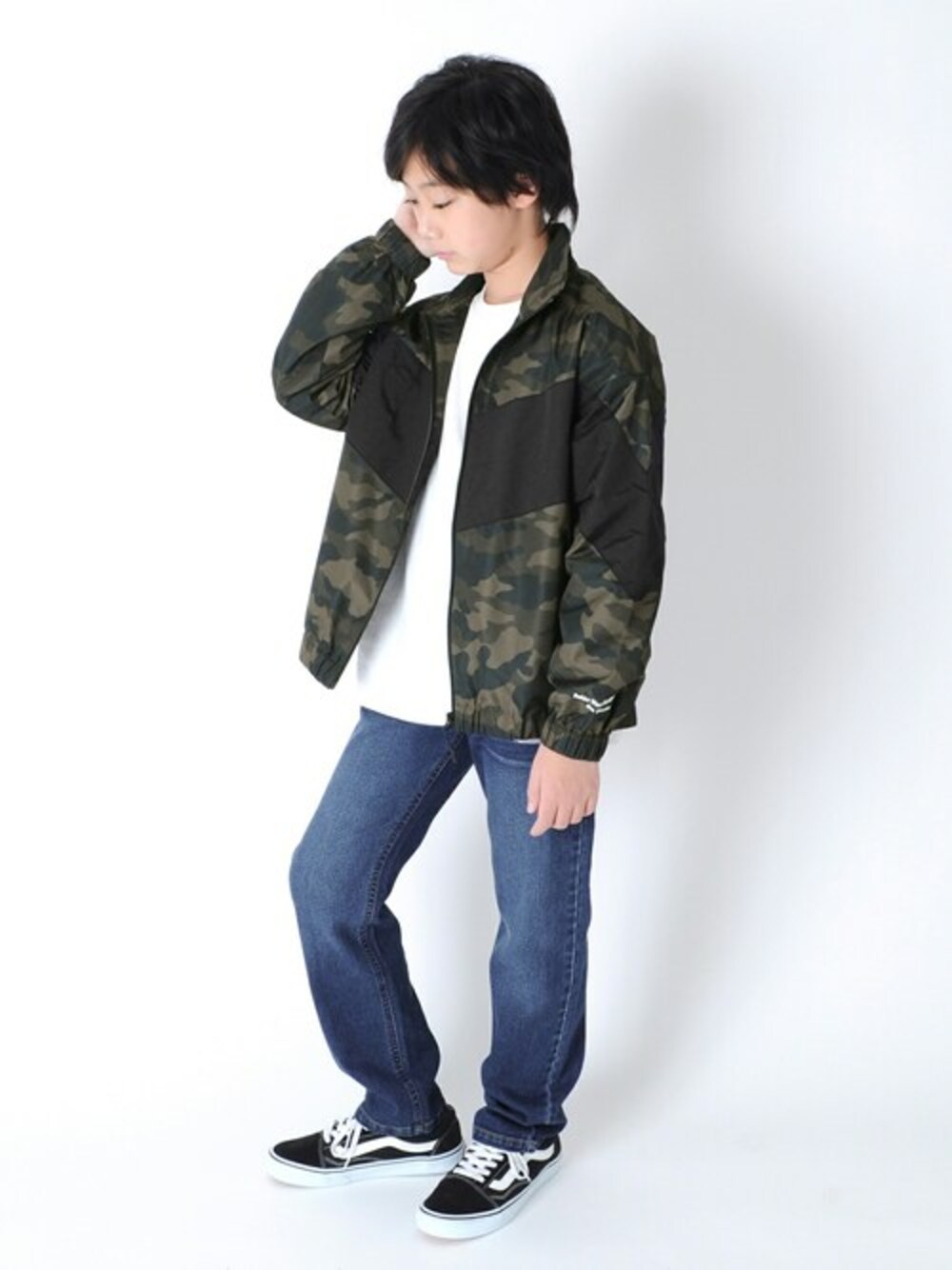 男の子らしいカモフラ柄は定番のデニム合わせで爽やかに。 落ち着いていながらも、かっこいいスタイルが完成します。