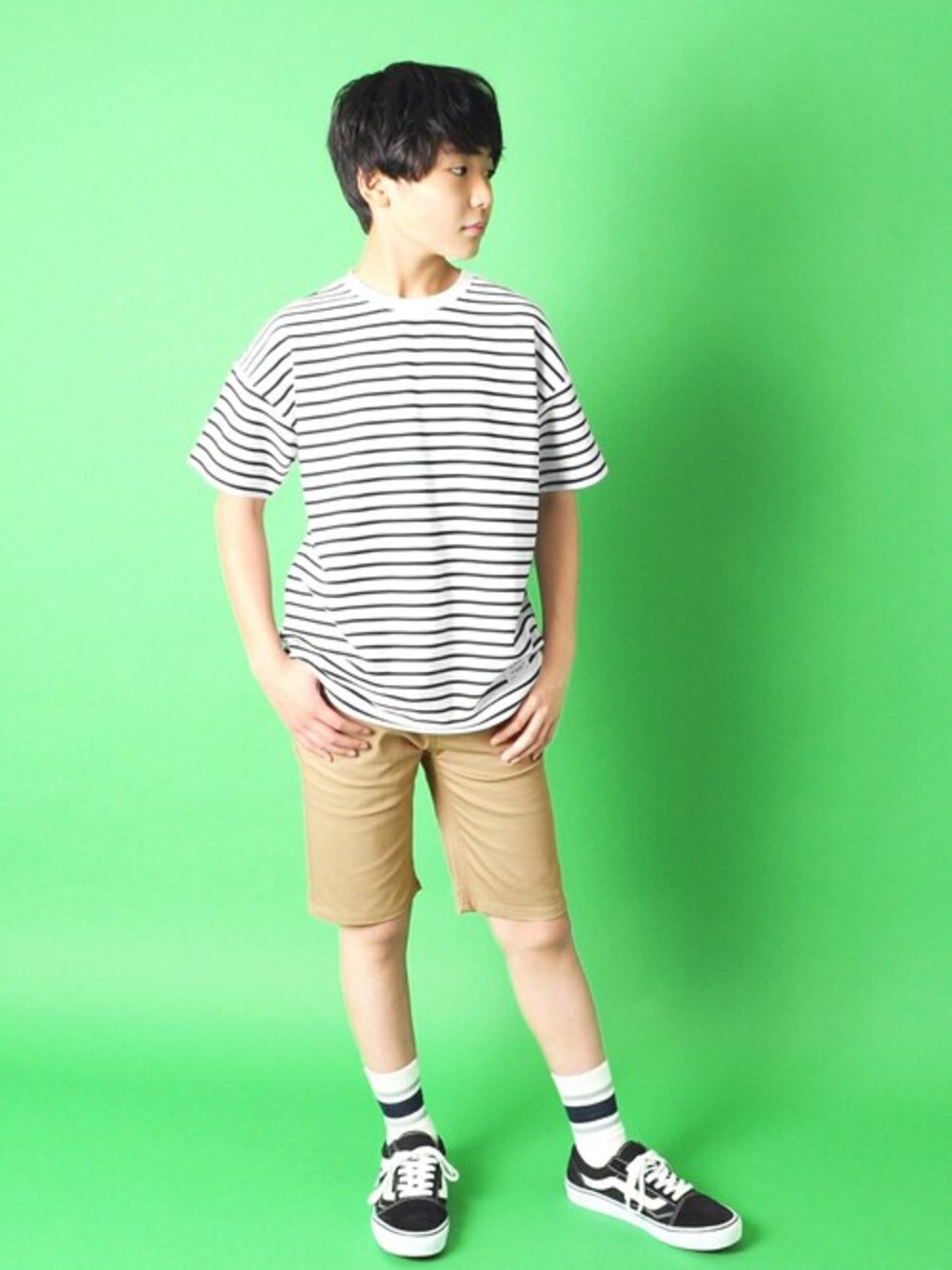 ゆったりとしたトップスにスリムなシルエットのハーフパンツを合わせ、バランスよく。 シロとベージュの王道コーデはデイリーにおすすめ。