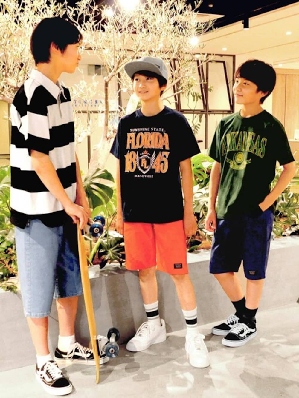 太めのボーダー柄やアメカジプリントで、カジュアルなスタイルにまとめて統一感のある着こなしに。 キャップを取り入れたりスニーカーのテイストを合わせ、ストリートな雰囲気にしています!