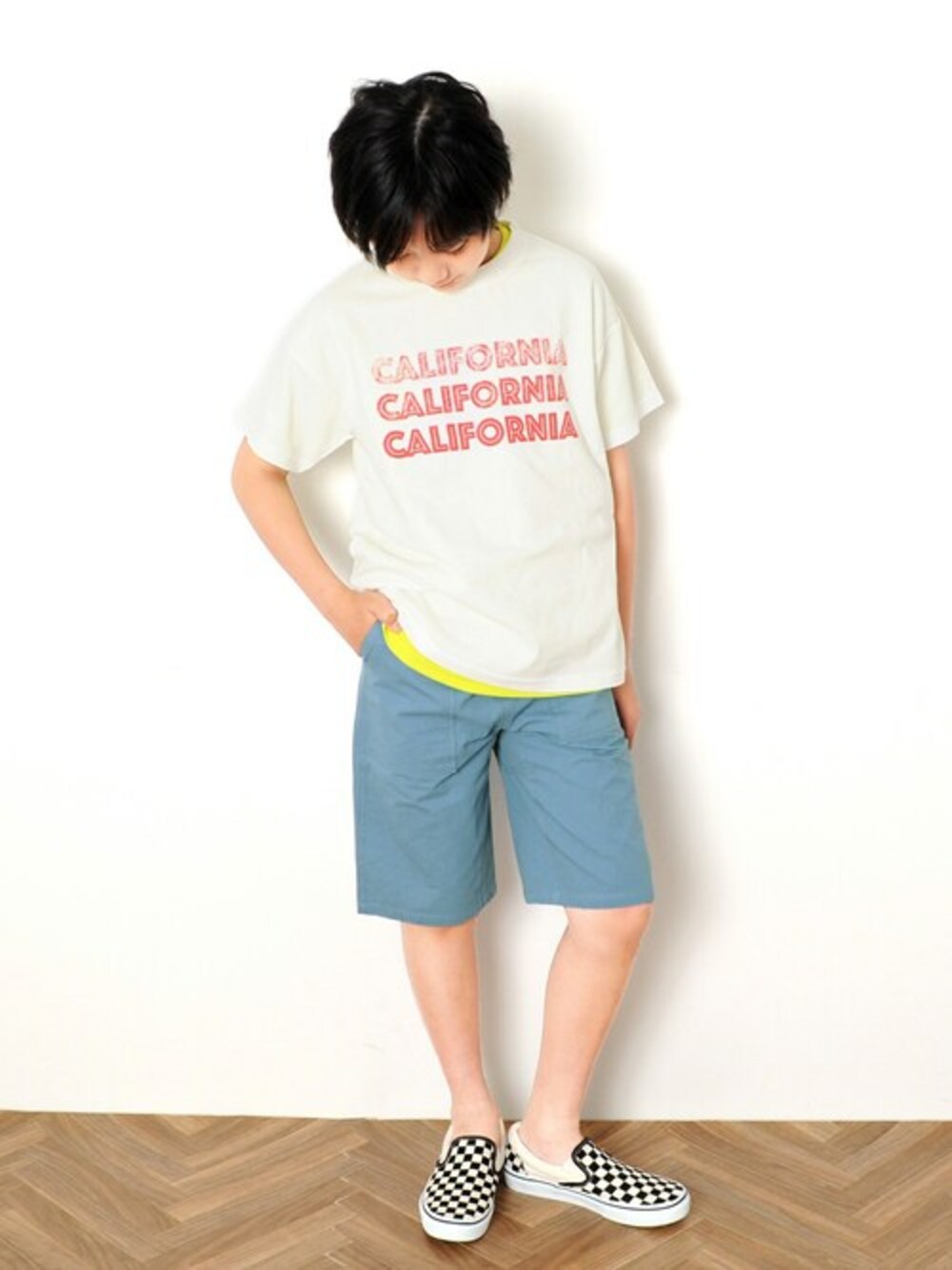 シロのトップスの中に鮮やかなレモンイエローのトップスをレイヤードし、爽やかな印象に。 ブルーのパンツと合わせ、夏らしく仕上げました!