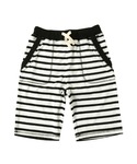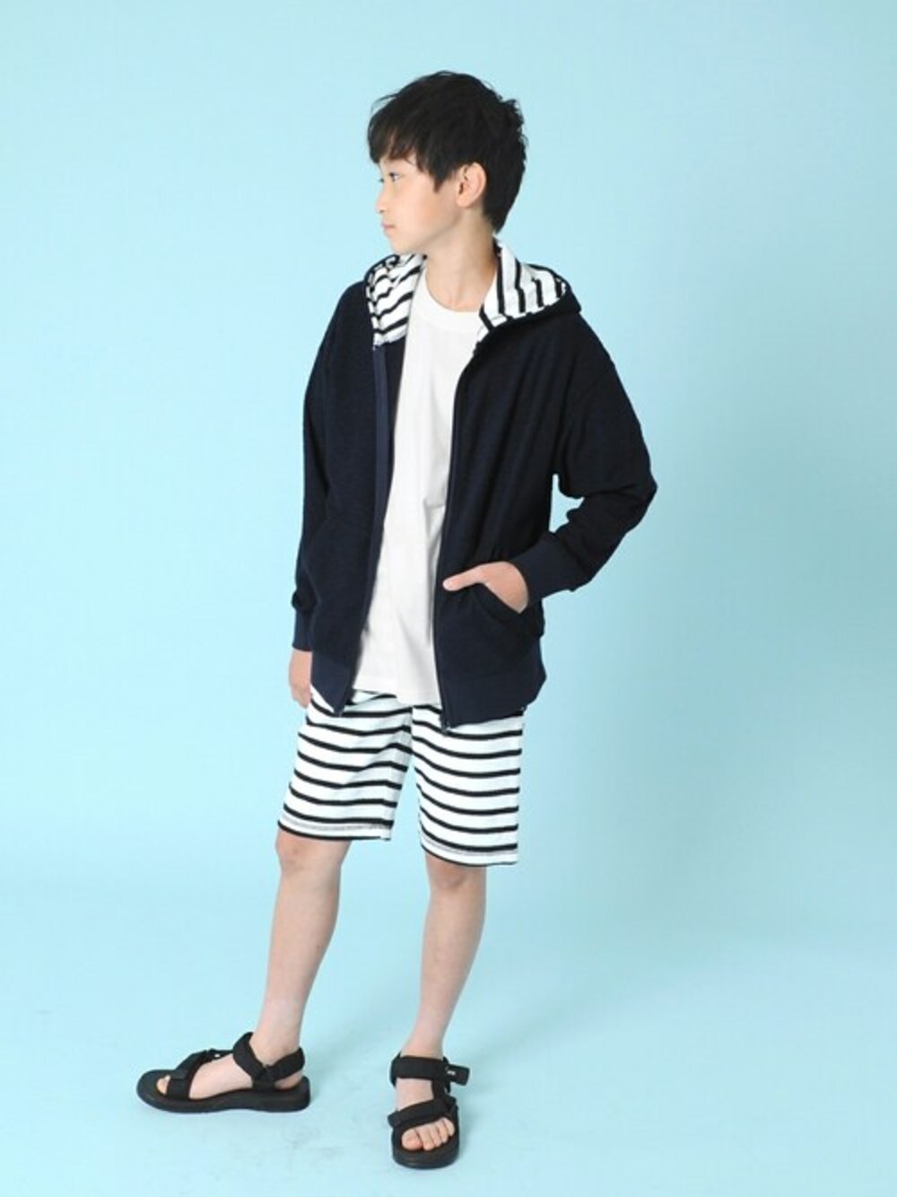 パーカーとハーフパンツを合わせたセットアップコーデ。 ボーダー柄を主役にすることで、爽やかなマリンスタイルに☆