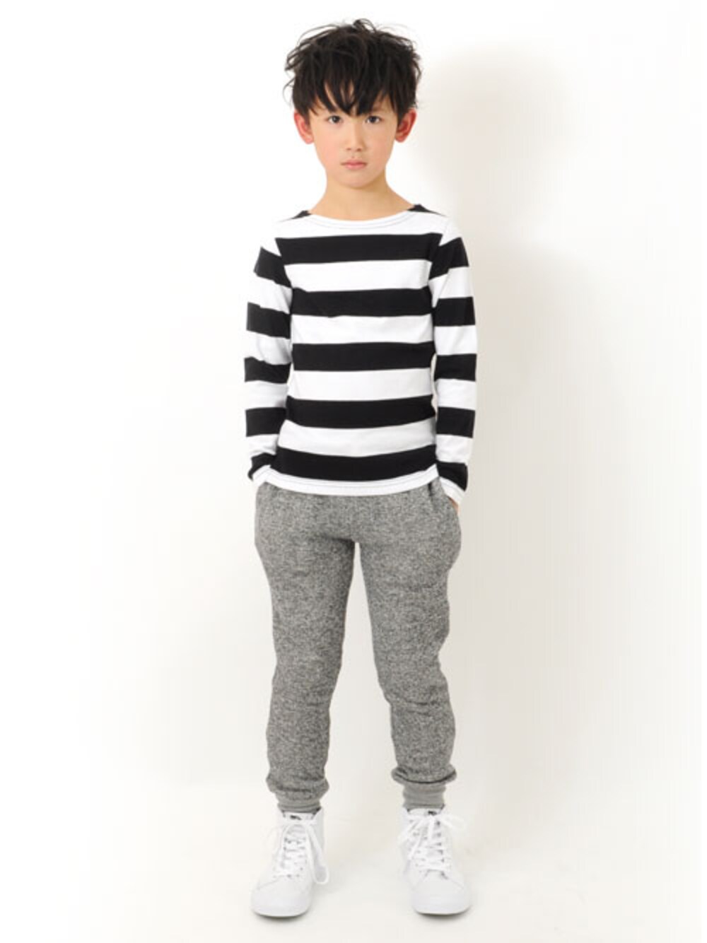 定番の白黒ボーダーが元気な印象のトップスは、ボートネックですっきりと。 粗挽きグレーのスウェットパンツはカジュアルな印象だけでなく履き心地もラクチン◎