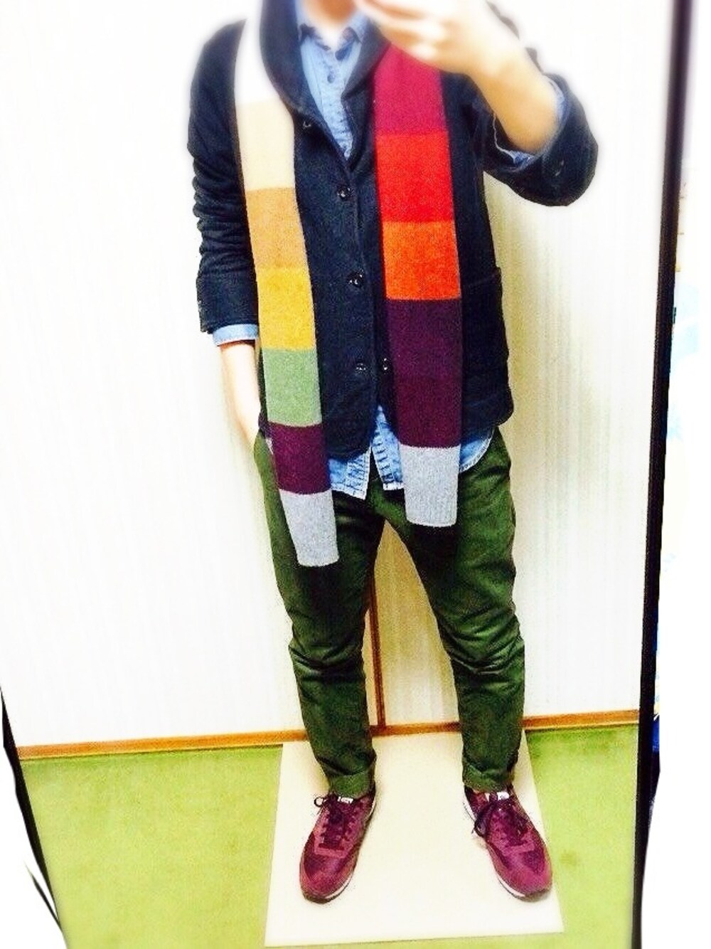 グリーン系のチノパンツ、その他のマフラーを着用したメンズの冬コーディネートの1枚目の写真