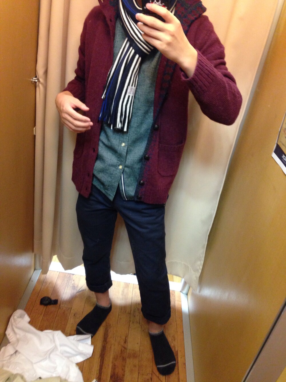 レッド系のニット/セーターを着用したメンズの春コーディネートの1枚目の写真