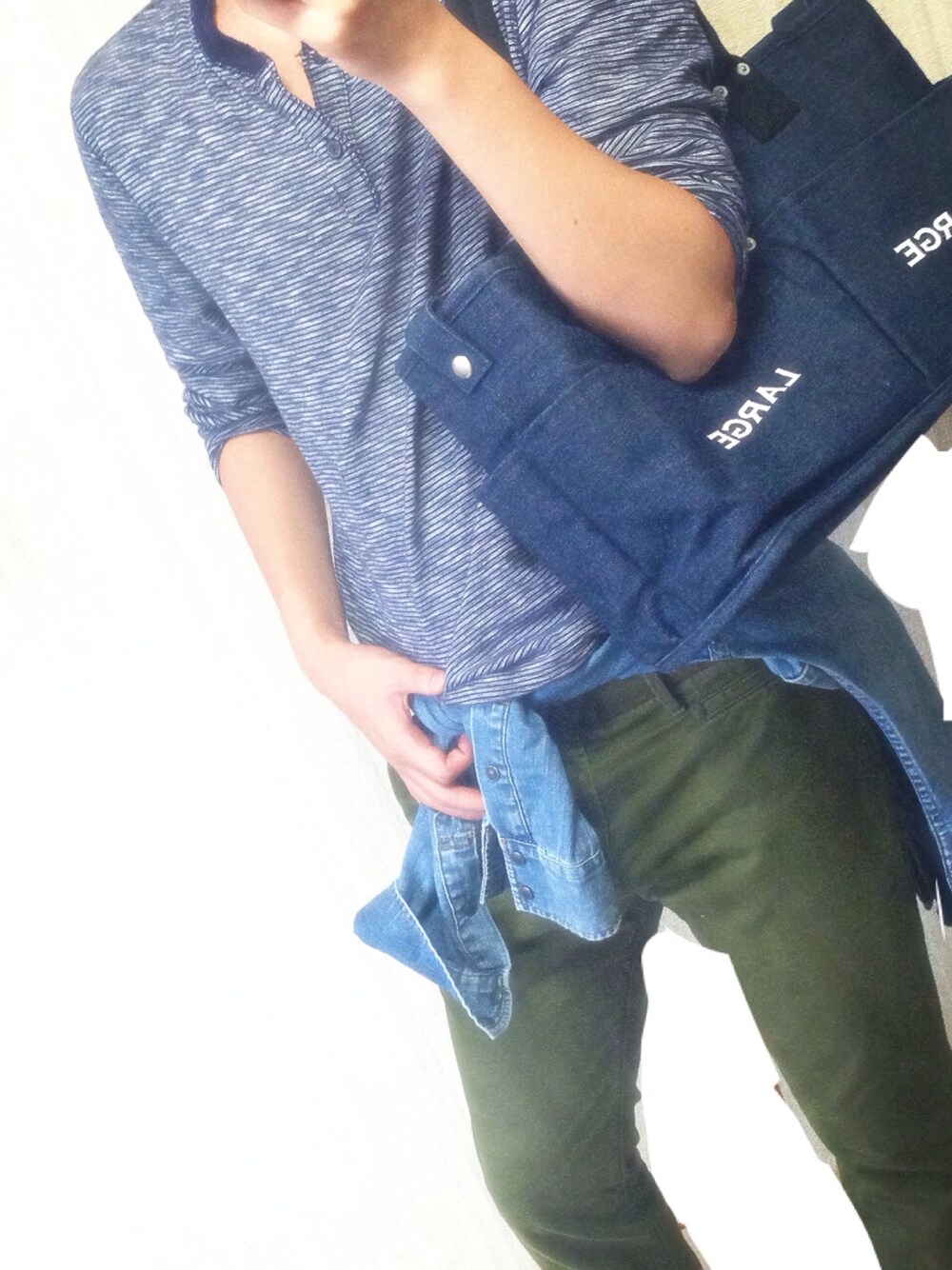 ブルー系のTシャツ/カットソー、グリーン系のチノパンツを着用したメンズの秋コーディネートの1枚目の写真