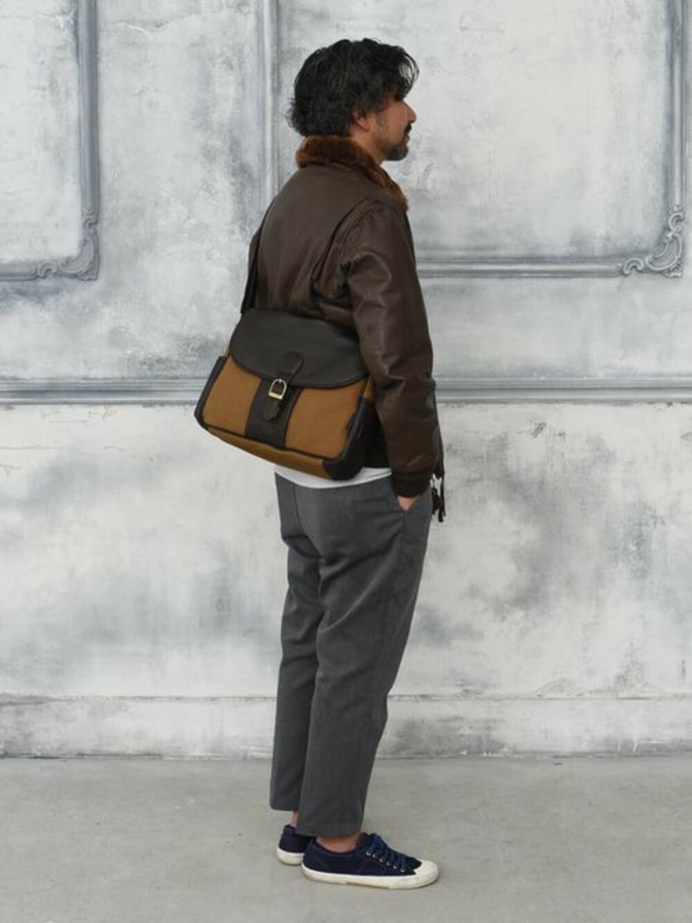 クラシックなレザージャケットに合わせて、バッグもクラシックなデザインのものにしてみました。