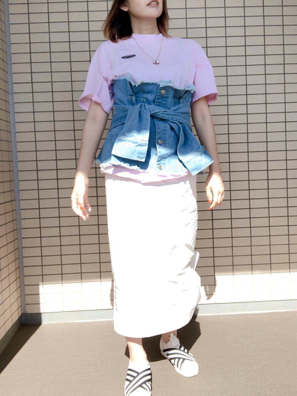 #お散歩コーデ ウエストのデニムは元から腰に巻く用のもの。代官山のセレクトショップで。