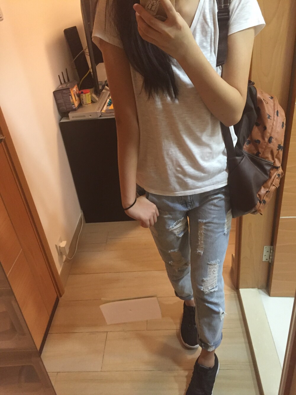 • white tee stressed jeans •