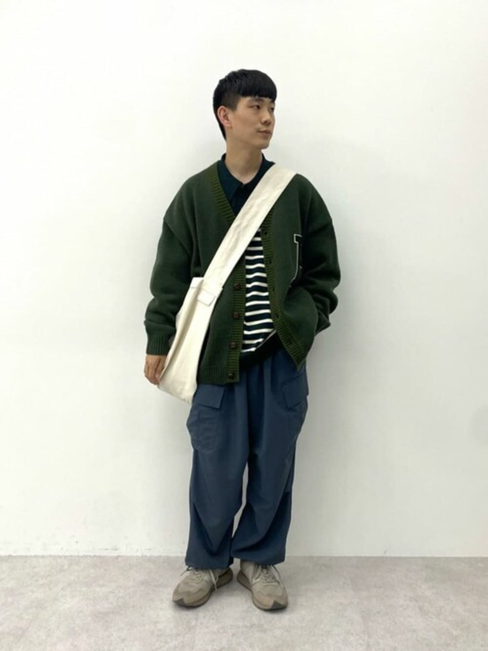 身長:169cm 【サイズ感】 カーディガン:ゆったりめ ニットポロ:ゆったりめ パンツ:ゆったりめ 【コーディネートポイント】 kinokoさん別注の"GLR or"カーディガンを用いたスタイリング。 インナーにニットポロを合わせて上半身は品良くまとめました。 パンツにはカーゴパンツを合わせてスニーカーを履くことでカジュアルとのバランスが取れます。 もちろんスラックス合わせにスニーカーでも素敵な着こなしになりますがトレンド感を出すならカーゴパンツがオススメです!