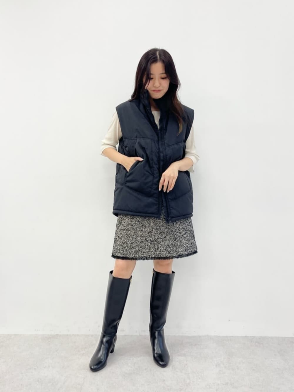薄手のインナーと合わせても暖かく、軽くて着やすいベストです。 ロングブーツを合わせて女性らしさ、トレンド感をプラスしました。