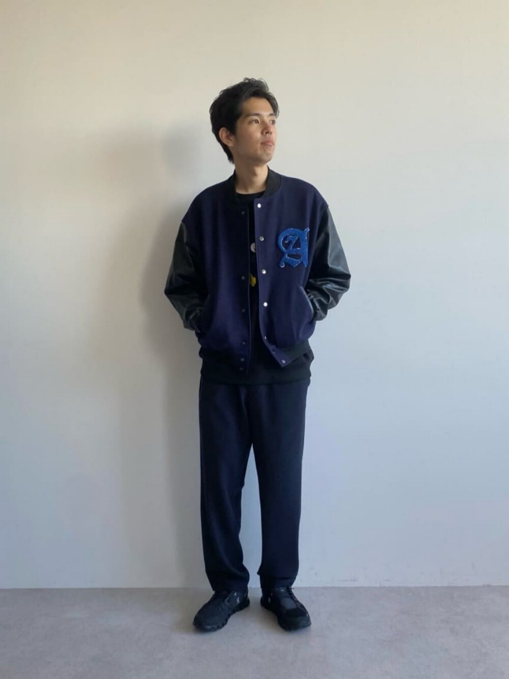 身長:178cm 個人的に今年の気分でもあるネイビー×ブラックの色合わせ。 インナーにはミッキーのプリントをさりげなく覗かせるのもこだわりです。