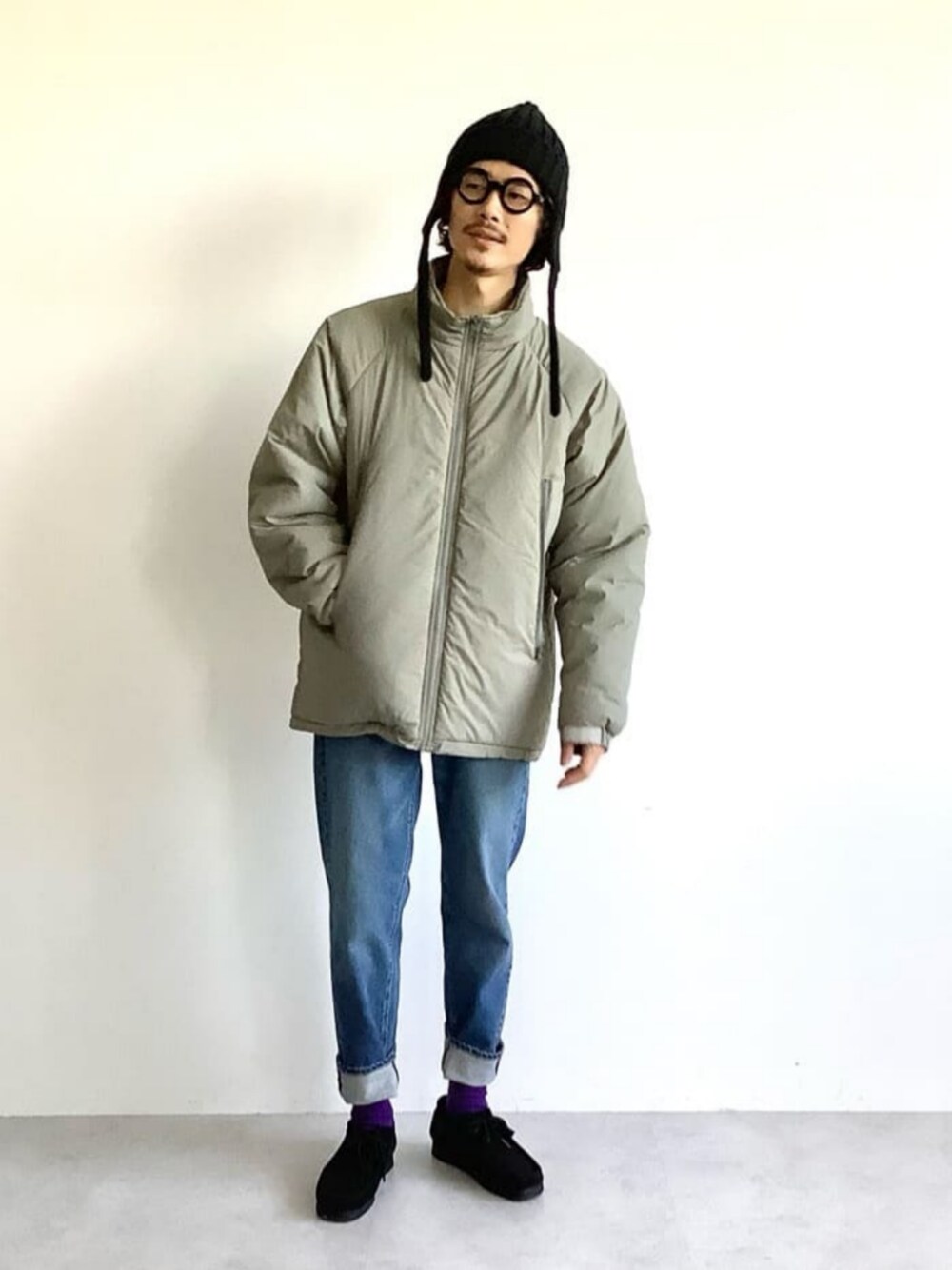 身長:178cm パテッドコートでコーディネートを組みました。 サイズ感が大きめなのでパンツはスッキリとしたデニムで。 足元はスニーカーと革靴の中間でちょうどいいクラークスで合わせました。