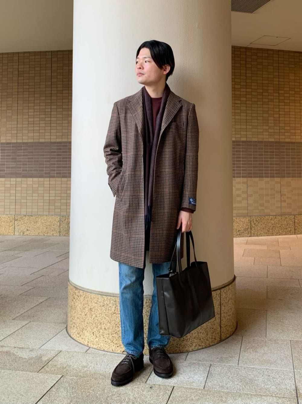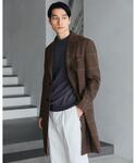 身長:177cm ブラウン系のチェックのコートを主役に彩ったスタイルです。 茶系とも相性のよいワインカラーをインナーに着用。 コートよりもトーンが濃いめのマフラーを巻かずに、首からかけるだけにして、スマートな印象にしました。シューズやバックもブラウントーンで統一しています。