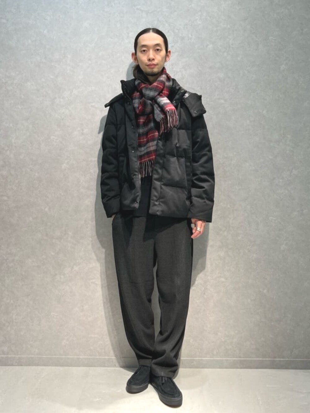 スポーティになりがちなダウンジャケットをオールブラックで大人ごなしな雰囲気にしたコーディネート。 ポップな色柄の小物で重たさを軽減したのがポイントです。