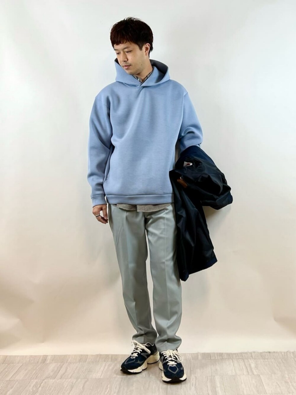 身長:181cm トップス、ボトムスが柔らかいブルーなので、シャツをアクセントにしました。