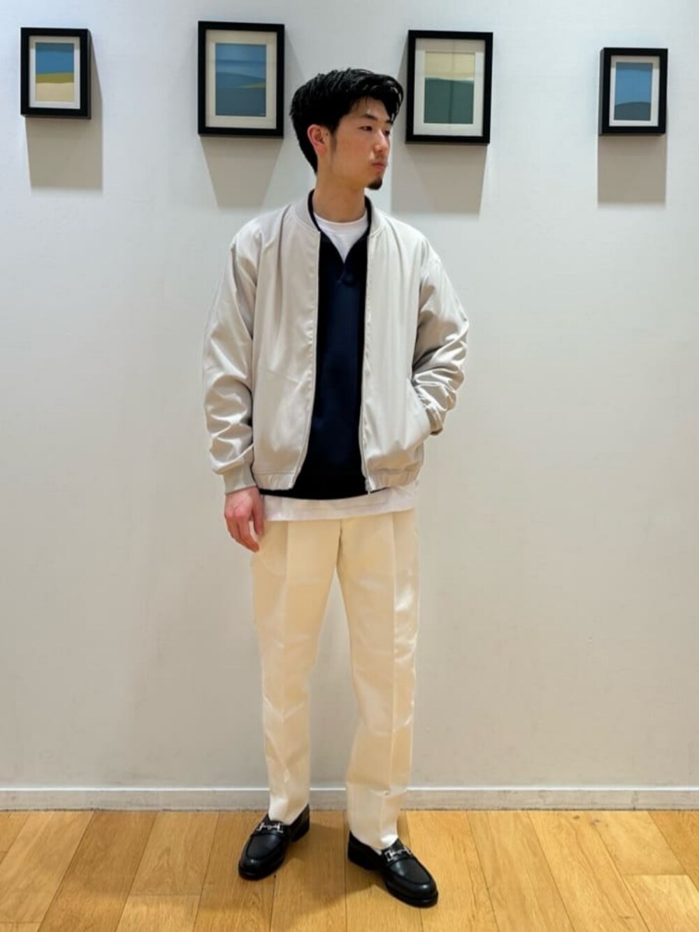 身長:172cm インナーのトップスとシューズでカラーを引き締め、全体的にぼやけないよう意識したスタイリングです。