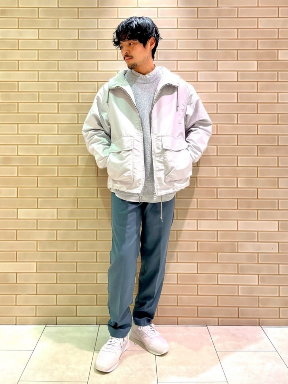 身長:168cm 軽やかな素材感のデッキパーカーはこの時期に使い勝手◎です。ニュアンスカラー同士で合わせて春らしい優しいトーンでコーディネートしました。
