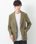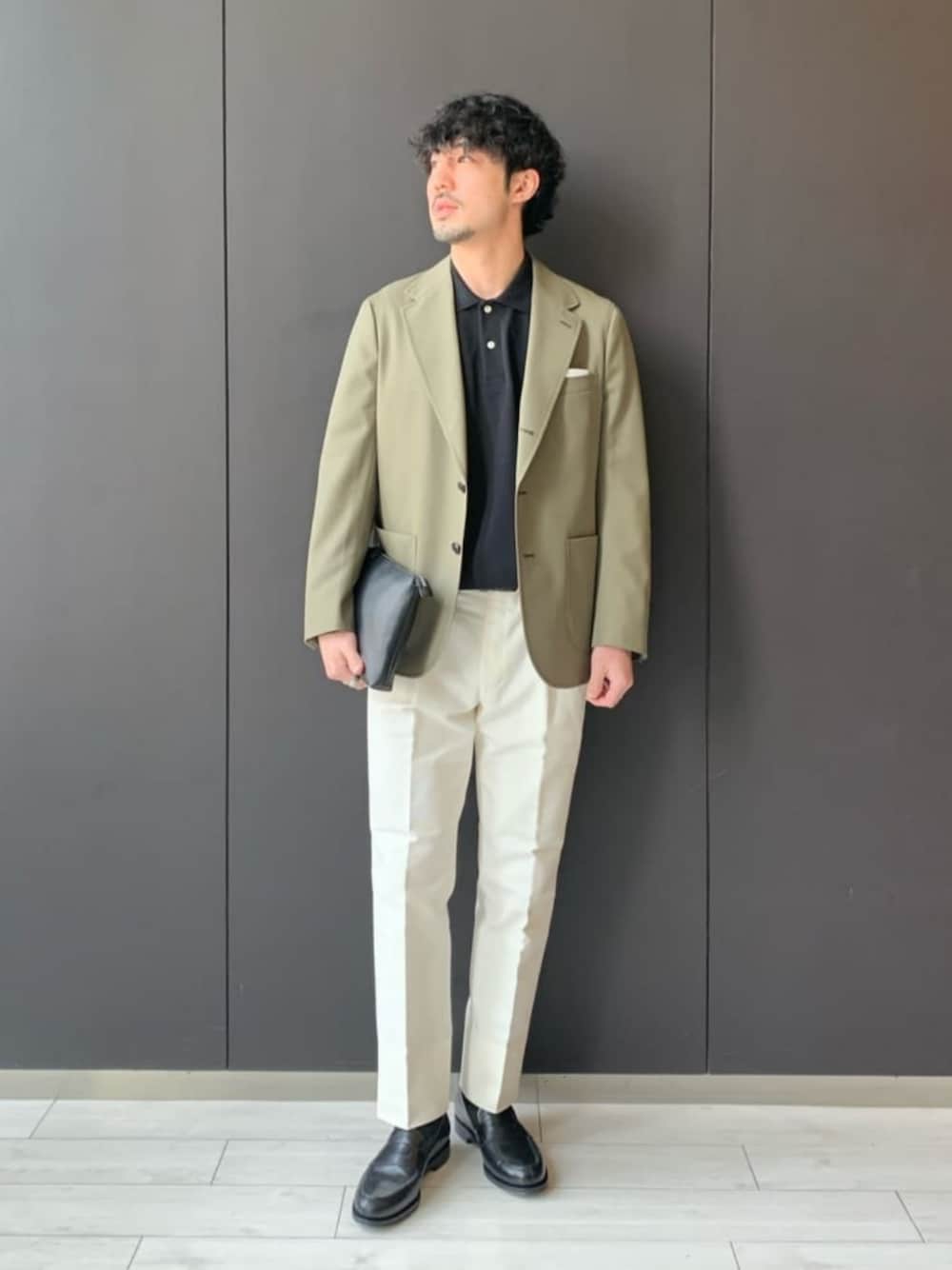 身長:181cm オリーブのジャケットにホワイトのタックパンツを合わせた春のジャケットスタイル。