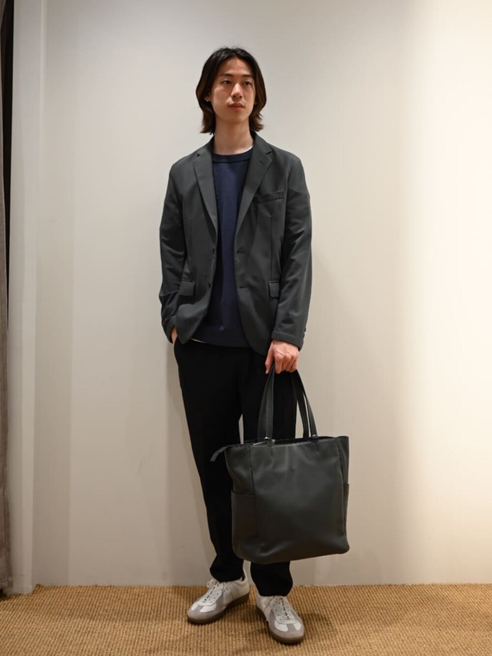 身長:176cm はずしでスニーカーを合わせた、硬くなりすぎないジャケットスタイルです。