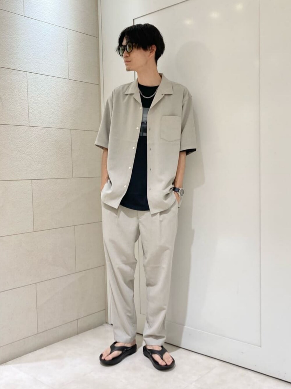 身長:176cm ベージュのセットアップを使って、カジュアルなスタイリングを組みました。 インナーとシューズの色を合わせることで、統一感のあるスタイリングにしています。
