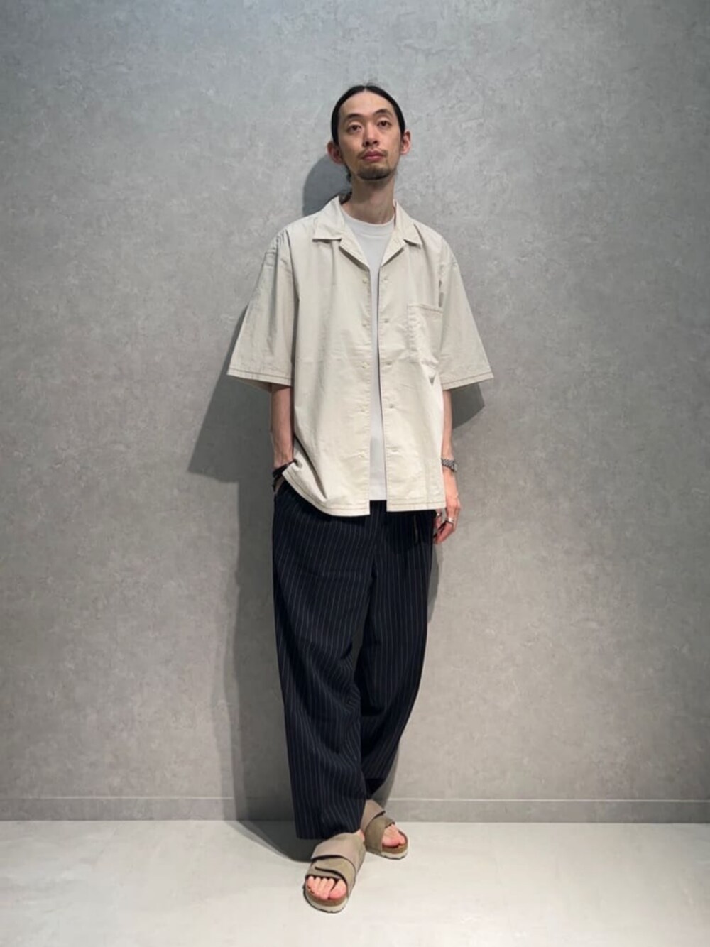 身長:178cm 麻混のパンツにサンダルを合わせた大人の夏コーデ。 大きめシルエットのシャツでヌケ感を出し余裕のあるコーディネートにしました。