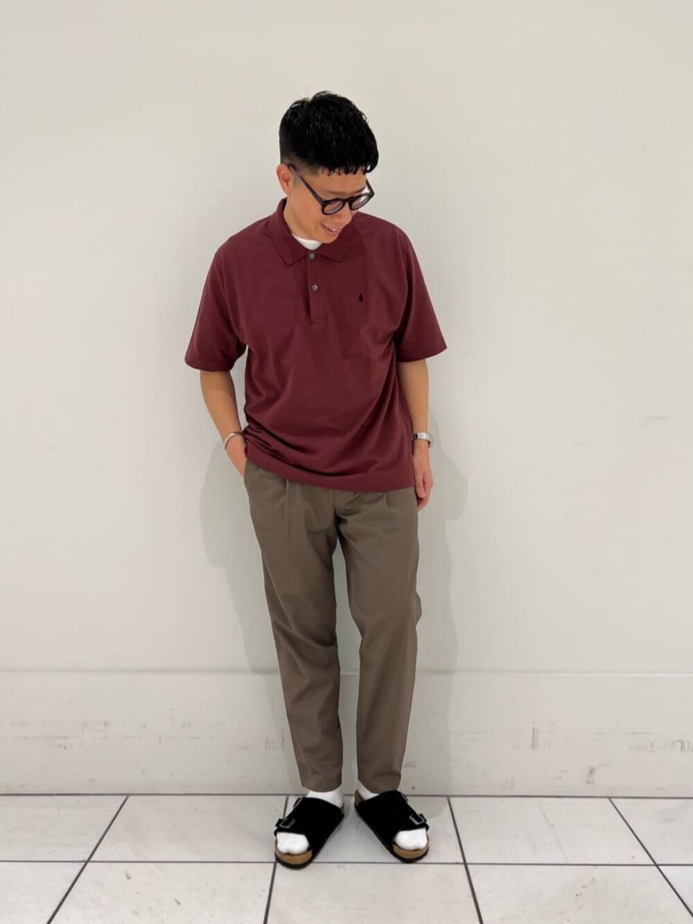 身長:166cm 大人なリゾート感あふれるポロシャツコーディネート。 ポロシャツのワインカラーを拾うようにボトムスも暖色のブラウンを。 サンダルはブラックを合わせて、コーディネートがぼやけないよう意識しました。
