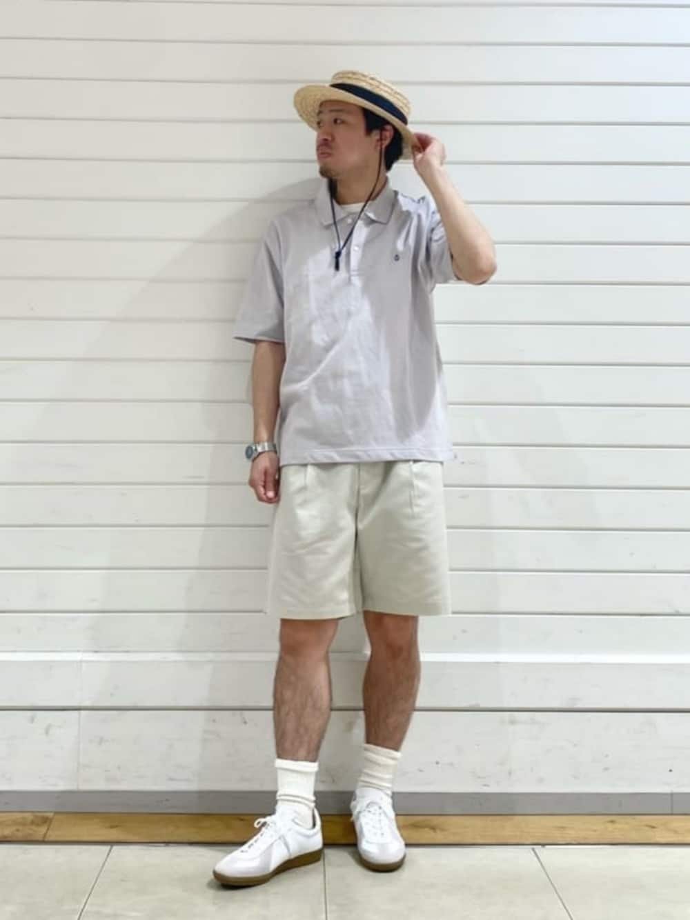 身長:169cm クリアな色で統一したリゾートスタイル。幼くなりがちなショーツスタイルもポロシャツや小物を着用するだけで様になります。街使いはもちろん、レジャーやアウトドアシーンでも際立つオススメスタイルです。