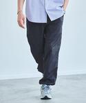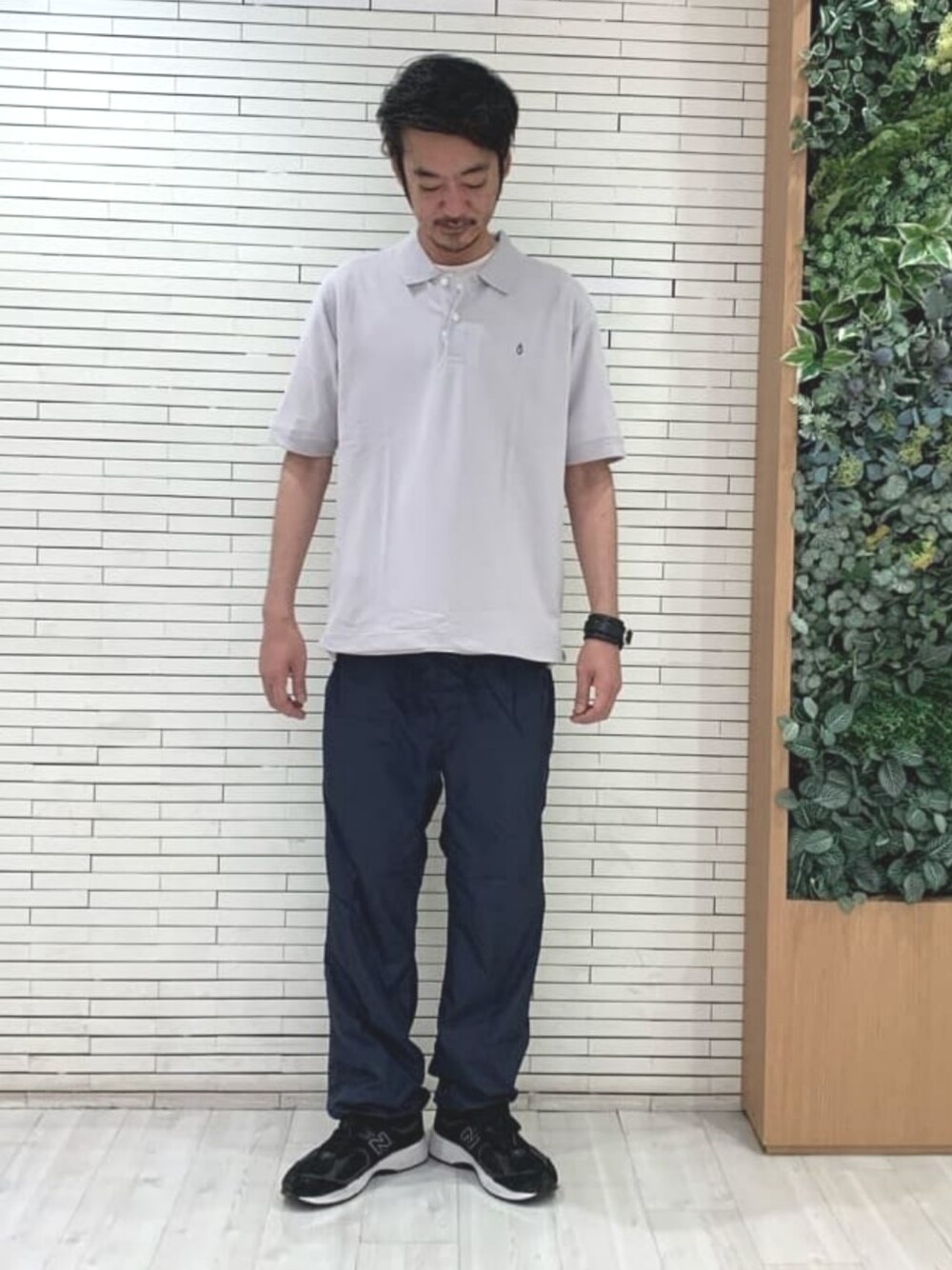 身長:183cm ベーシックなポロシャツとナイロンパンツのスポーティーなコーディネートです。グレーとネイビーでクリーンな印象になるようにいたしました。