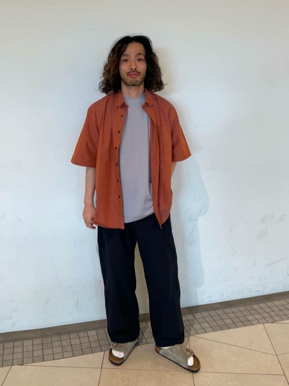 身長:164cm オレンジのシャツを軸にコーディネートしました。インナーは、サッカーストラップ生地で、夏らしさを出しました。