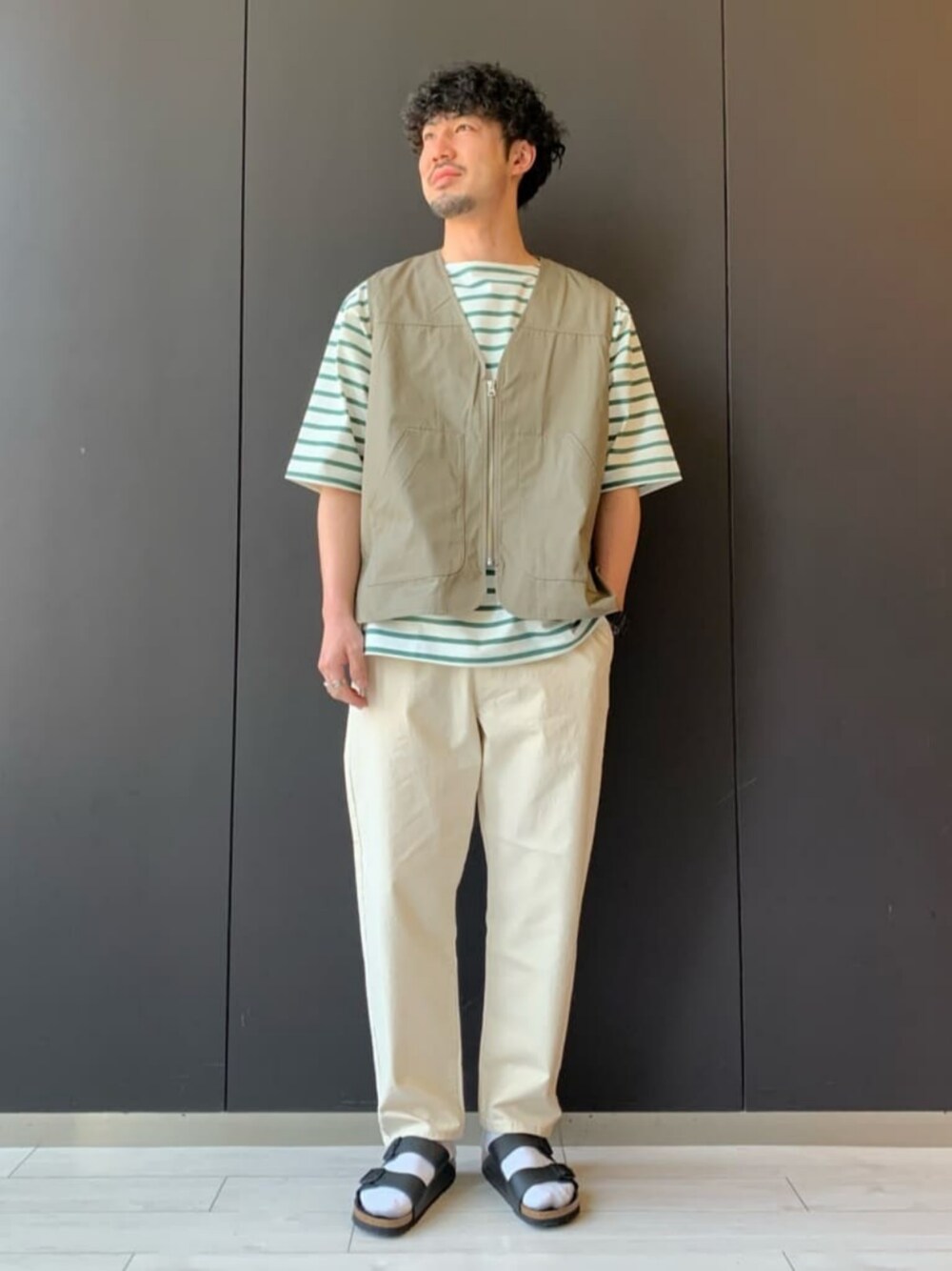 身長:183cm カットソーだけでは物足りない時に大活躍のベスト。ボーダーに合わせるとトレンド感満載。ホワイトパンツにサンダルで爽やかな雰囲気を