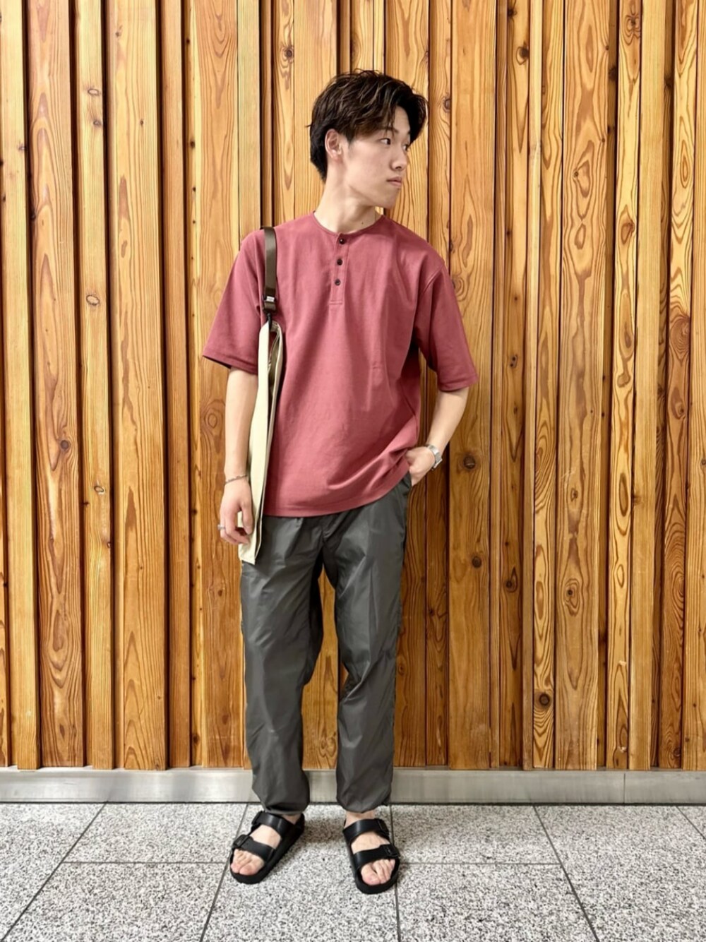 身長:183cm ワインレッドのトップスに茶系のナイロンパンツを合わせたコーディネートです! サンダルを用いることにより、上品かつラフな感じを表現しております!