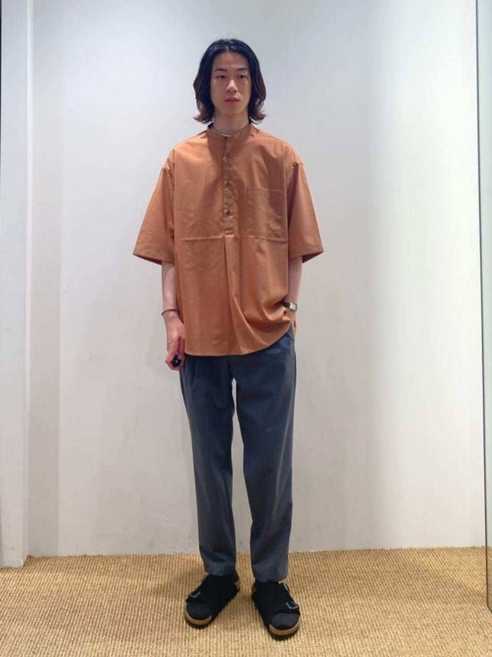 身長:176cm 色味爽やかなオレンジカラーを取り入れた夏スタイルです。