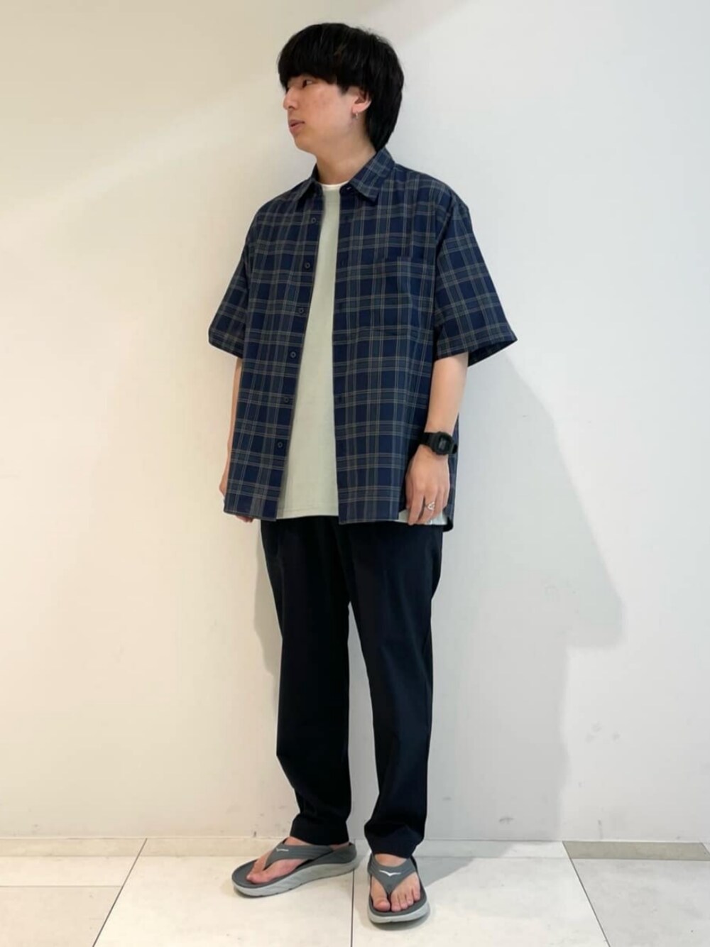 身長:164cm チェックのラインとインナーの色を合わせて統一感を出してます。 サンダルも同系統の色で合わせたので、全体的にまとまりが出てます。
