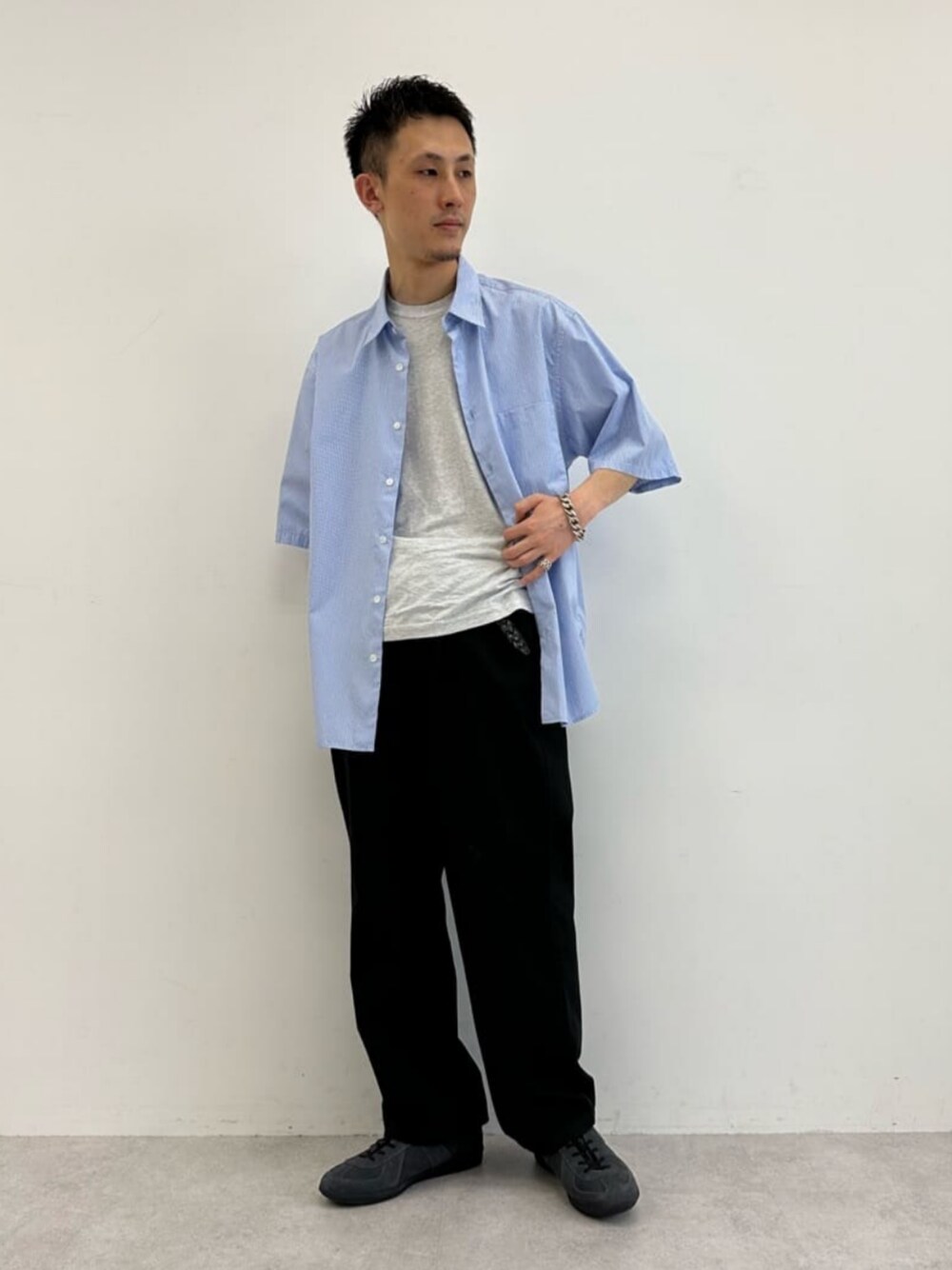 身長:174cm 別注ディッキーズをメインに、ブルーストライプシャツで爽やかな印象にしてみました。 足元はダークグレーのスエードスニーカーで大人な雰囲気をプラスしました。