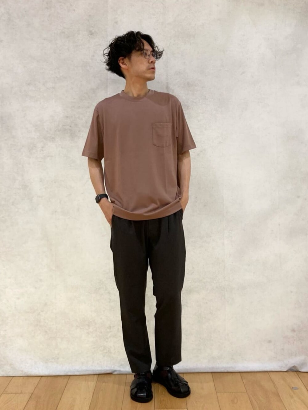 身長:176cm 足元はレザーサンダルを選ぶ事で上品な夏らしさをプラスしています。