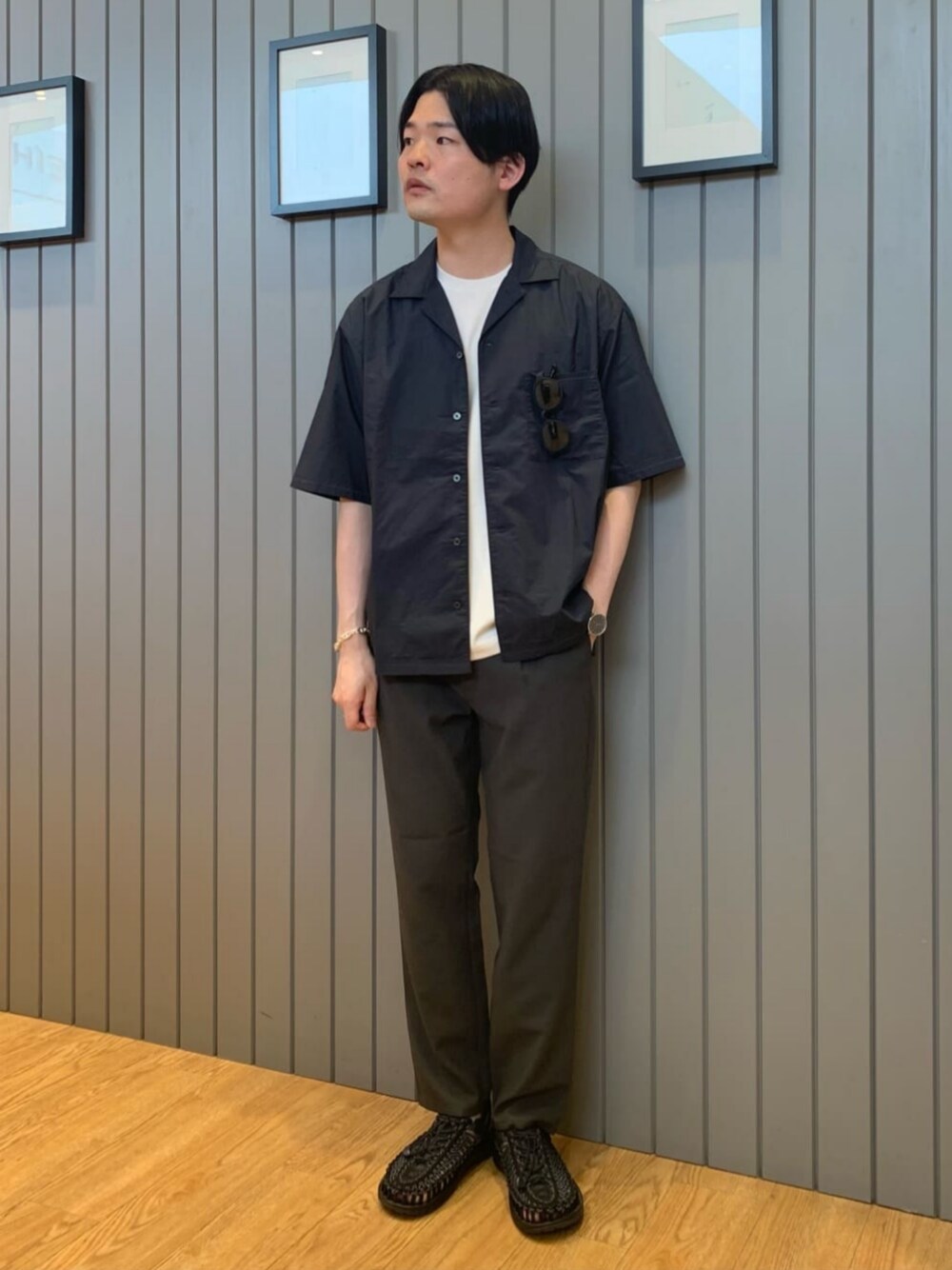 身長:177cm シンプルにダークトーンでまとめたシャツスタイル。 重い印象にならないように、インナーだけ白を合わせました。