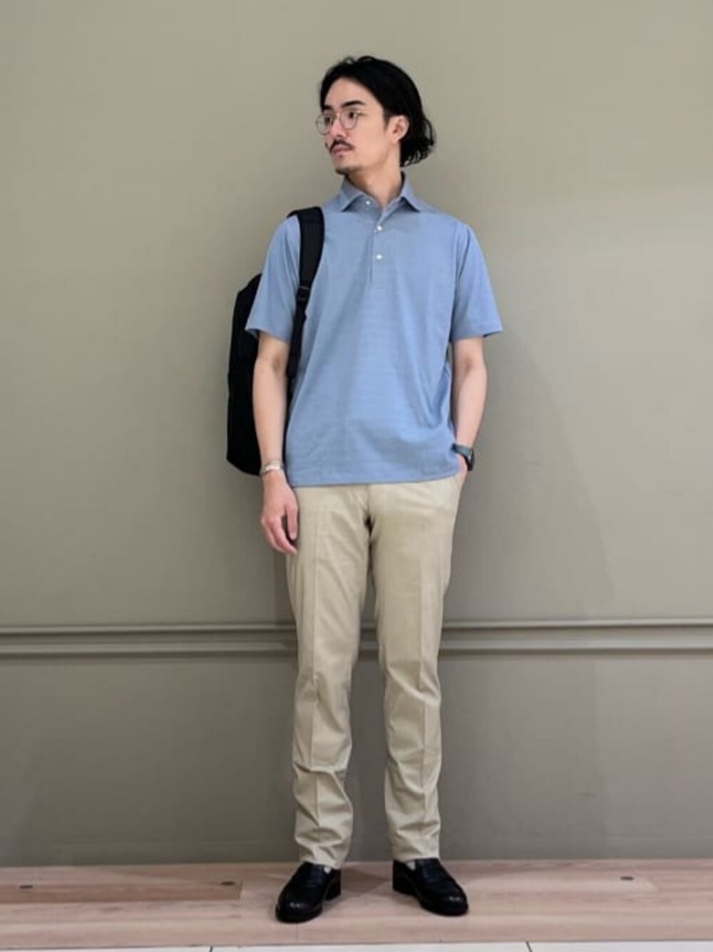 身長:182cm サッカー素材で肌離れもよく、さわやかなビズスタイルです。 ポロシャツは程よくカジュアルな質感なので、普段使いもして頂けます。