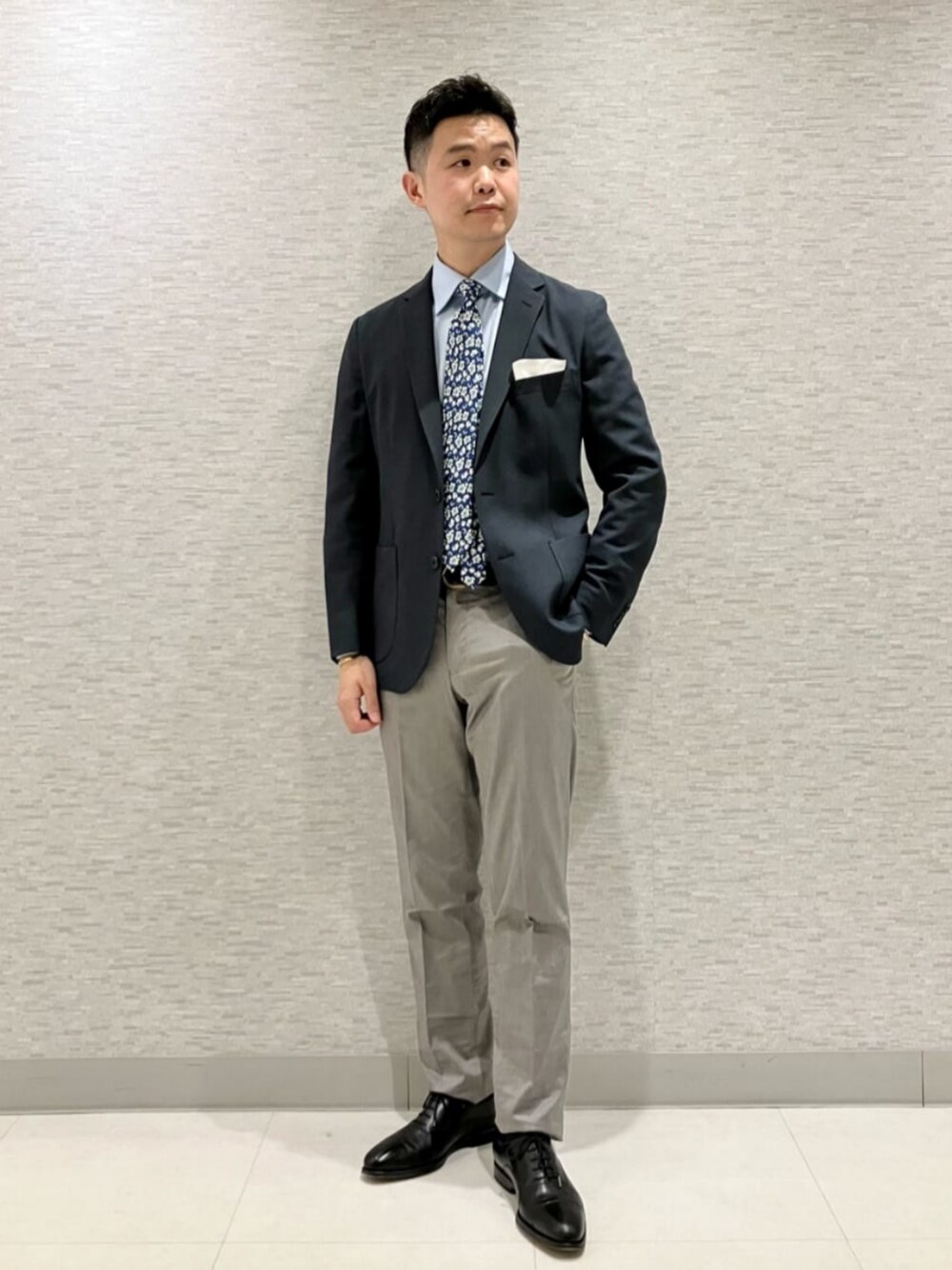 身長:173cm ベーシックな機能性ジャケットを華やかに見せる為に、フラワープリントのネクタイを合わせました。