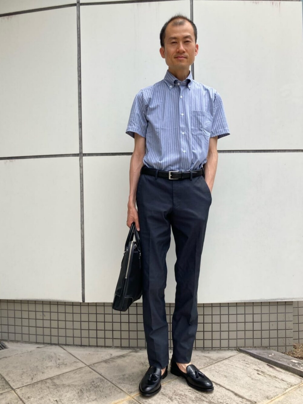 身長:173cm 半袖でもラフにみえすぎないようにネイビー、グレー系であわせました。