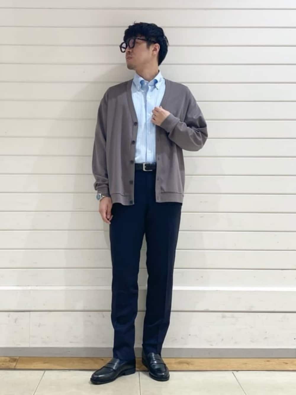 身長:169cm カーディガンは滑らかな質感が特徴的で洗練された印象に仕上がります。肌寒いオフィスでも大活躍の一押しスタイルです。