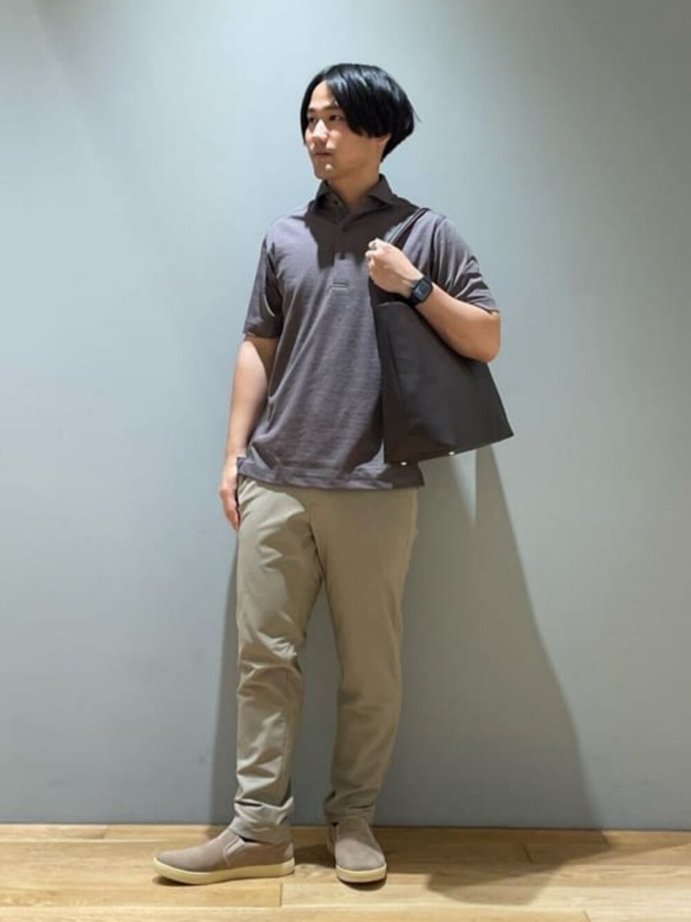 身長:164cm カラーをブラウン系統で合わせました。ビジネスカジュアルを意識して、サッカーのポロシャツを着用しました。パンツもオンオフで使える細みのパンツにしてます。