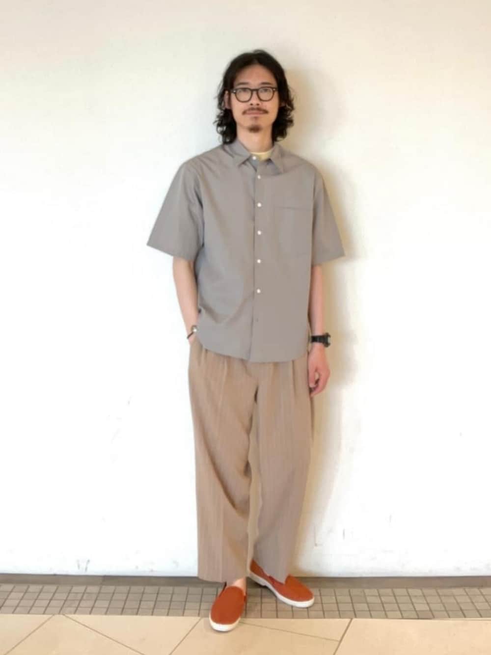 身長:178cm 淡い色味でコーディネートを組みました。シャツにスラックスを合わせたキレイめスタイルです。差し色で足元にオレンジ、インナーにイエローをさしています。