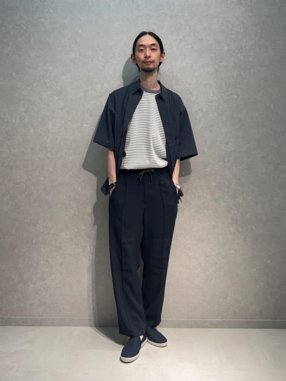 身長:178cm テロっとした生地感のシャツとパンツで大人ごなしなネイビーのコーディネートにしました。 Tシャツをタックインしたり、シューズをサンダルではなくエスパドリーユにしたのが大人っぽく見せられるポイントです。