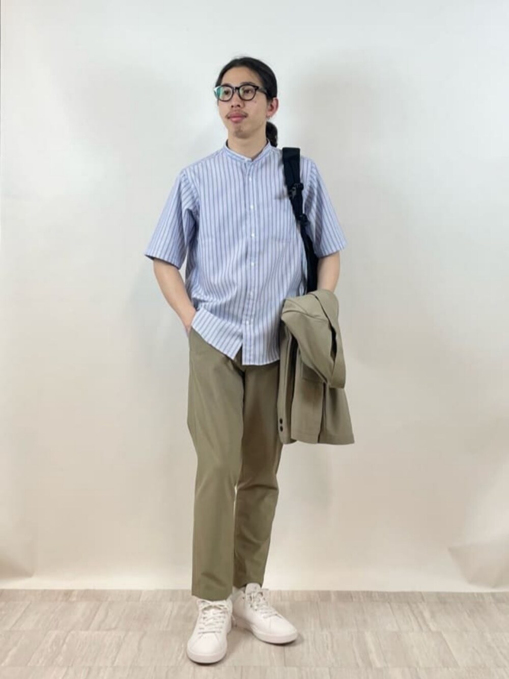 身長:168cm 明るめのカラーで合わせた夏らしいビジネスカジュアルスタイルです。ベージュ系の洋服のフワッとした印象を、ブルーのストライプシャツで爽やかに引き締めています。スニーカー合わせだとカジュアル過ぎる方にはローファーを履くのもオススメです。